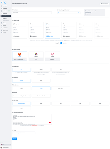 On the instance creation page, choose Ubuntu as your operating system for a Medium size instance, and paste the below code in the installation script section: