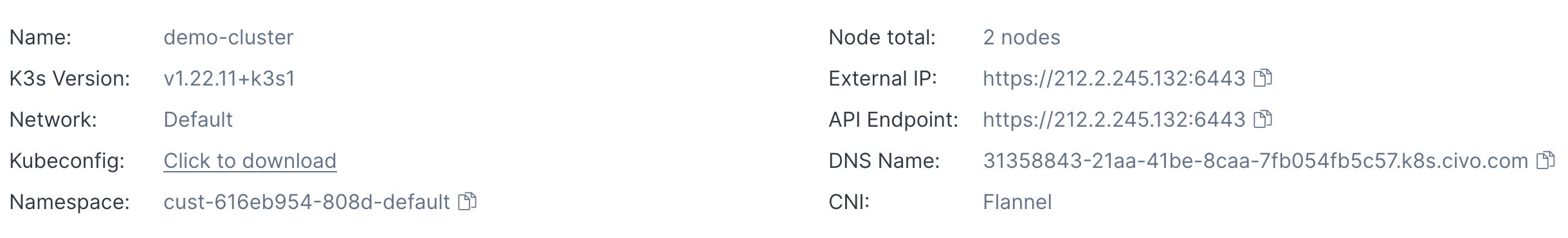Once running, you can use kubectl and the downloaded kubeconfig file from the cluster's page to interact with your cluster. You will find the kubeconfig file for download in the "Cluster information" section: