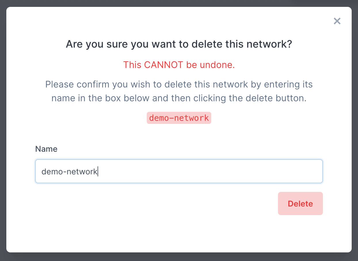You will need to input the name of the network to delete as a confirmation. Once you do, the network can be deleted: