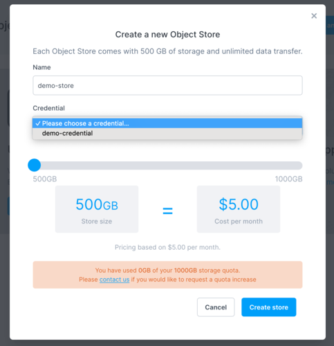 You can size an object store in 500GB increments up to your object store quota limit. The price (displayed monthly but charged on an hourly basis) will change depending on the size of the object store you create.