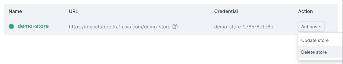 You can delete an object store from your account by navigating to the listing of object stores and selecting "Delete store" from the Action column: