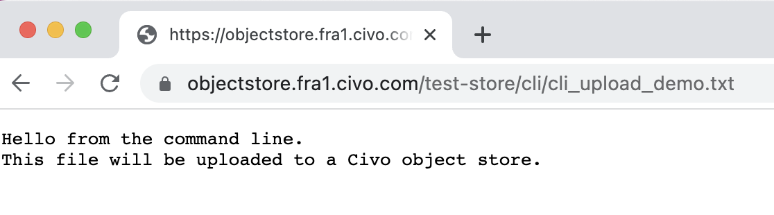 Public URL of the object is: http://objectstore.fra1.civo.com/demo-store/cli/cli_upload_demo.txt