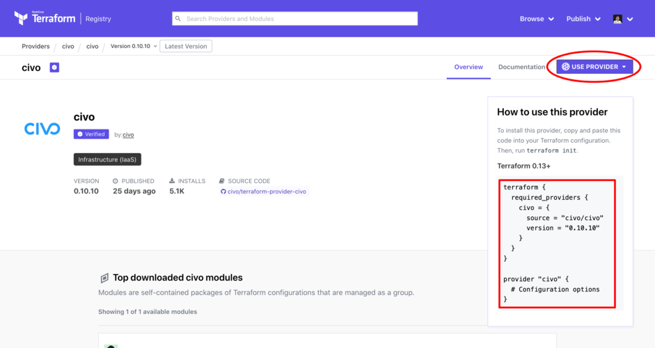 The file should contain the provider information from the Civo Terraform Provider page that you get when you select "Use Provider":