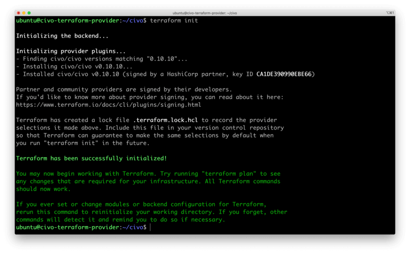 In order to initialize our Terraform project, run the command below to download the Civo Terraform provider and set it up it with required files and folders: